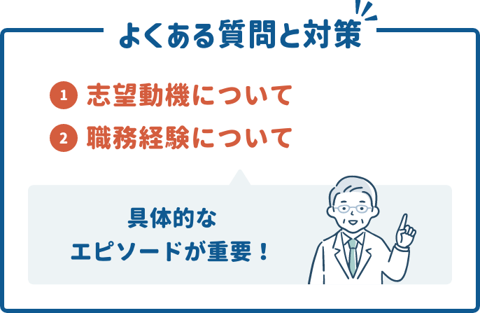 面接では、さまざまな質問がされます。以下に代表的な質問とその対策を示します。