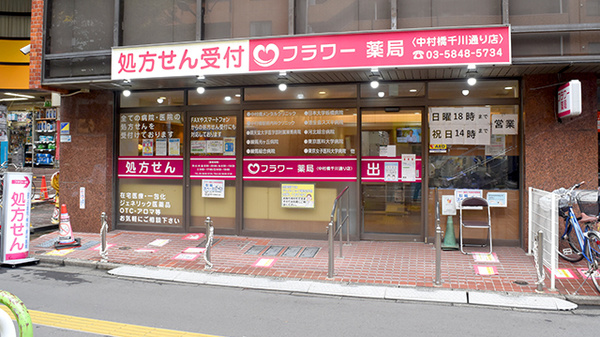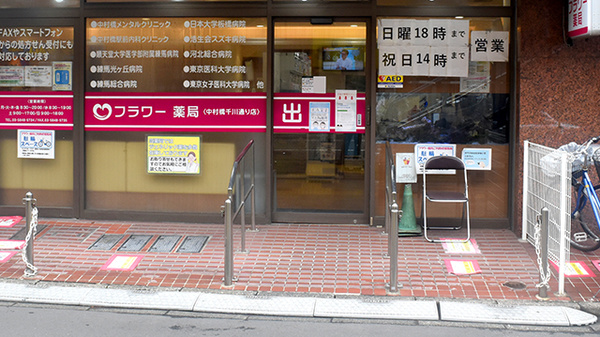 フラワー薬局 中村橋千川通り店は西武池袋線の中村橋駅から徒歩1分に位置しております。サンハルクを代表する面処方店舗のひとつです。沿線でドミナント展開をしており、自転車10分圏内に6店舗あります。人員や医薬品をエリアで融通するという側面があり、休暇の取得のしやすさ、医薬品の供給のしやすさに繋がっています。