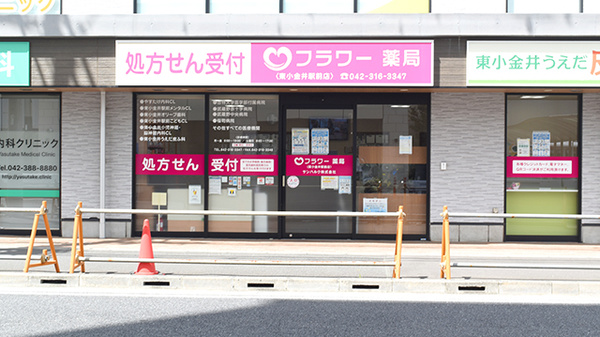 フラワー薬局 東小金井駅前店はJR中央線・東小金井駅南口から徒歩すぐの場所に位置する利便性の高い店舗です。駅周辺には内科・小児科・耳鼻科など複数のクリニックがあり、多様な処方に対応しています。近隣店舗とのエリア連携も確立されており、人員フォローや医薬品の融通がしやすく、休暇を取得しやすい働きやすい環境が整っています。